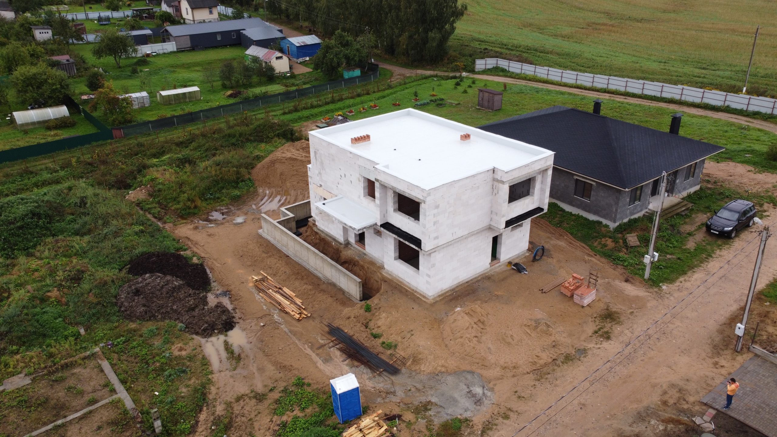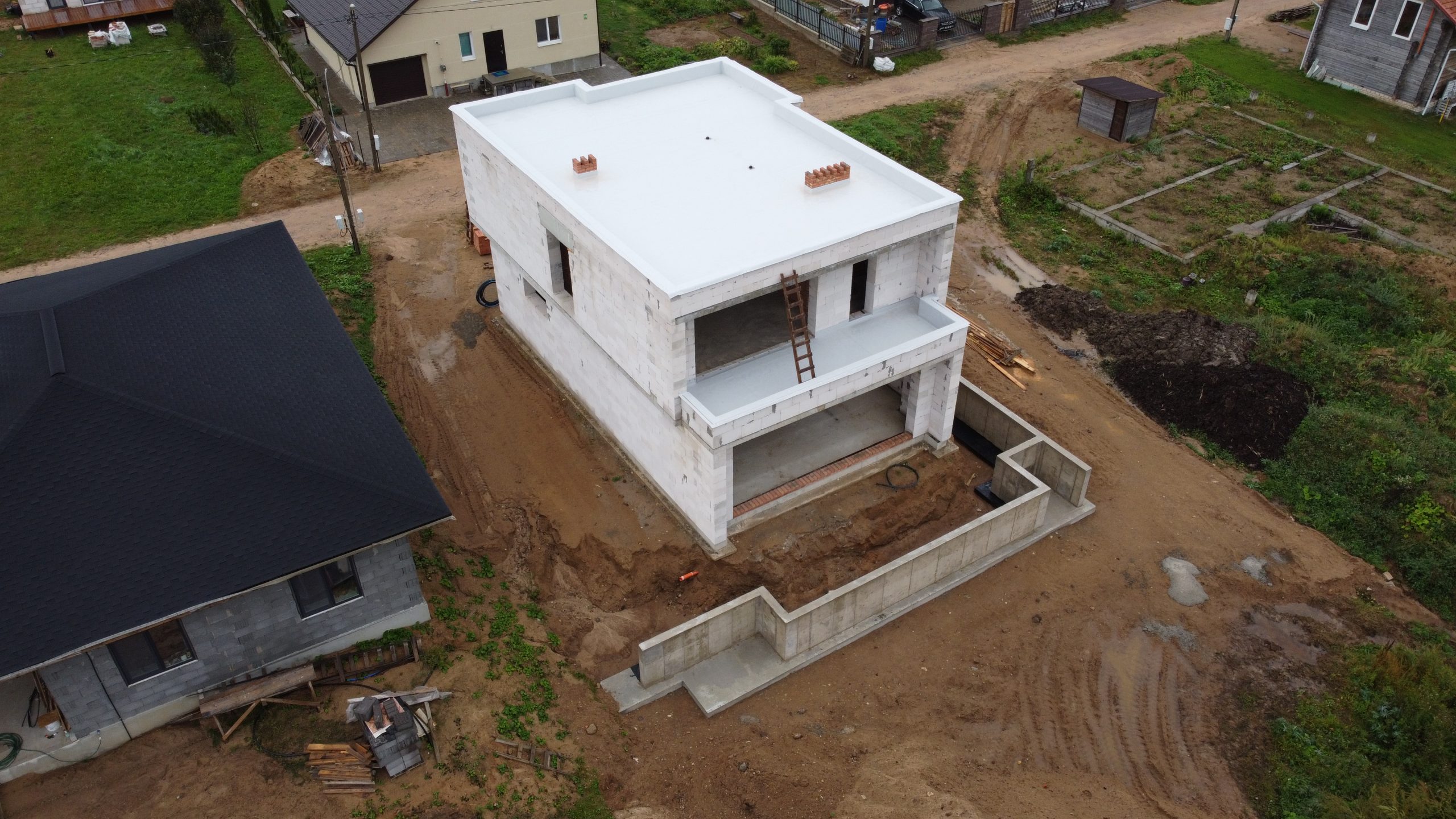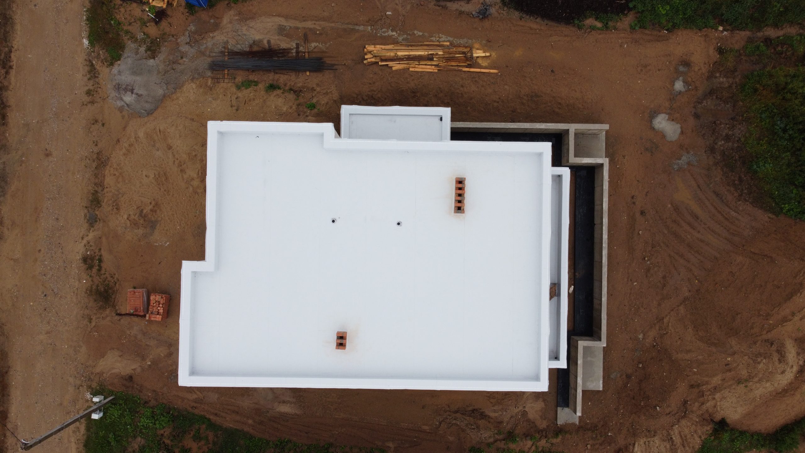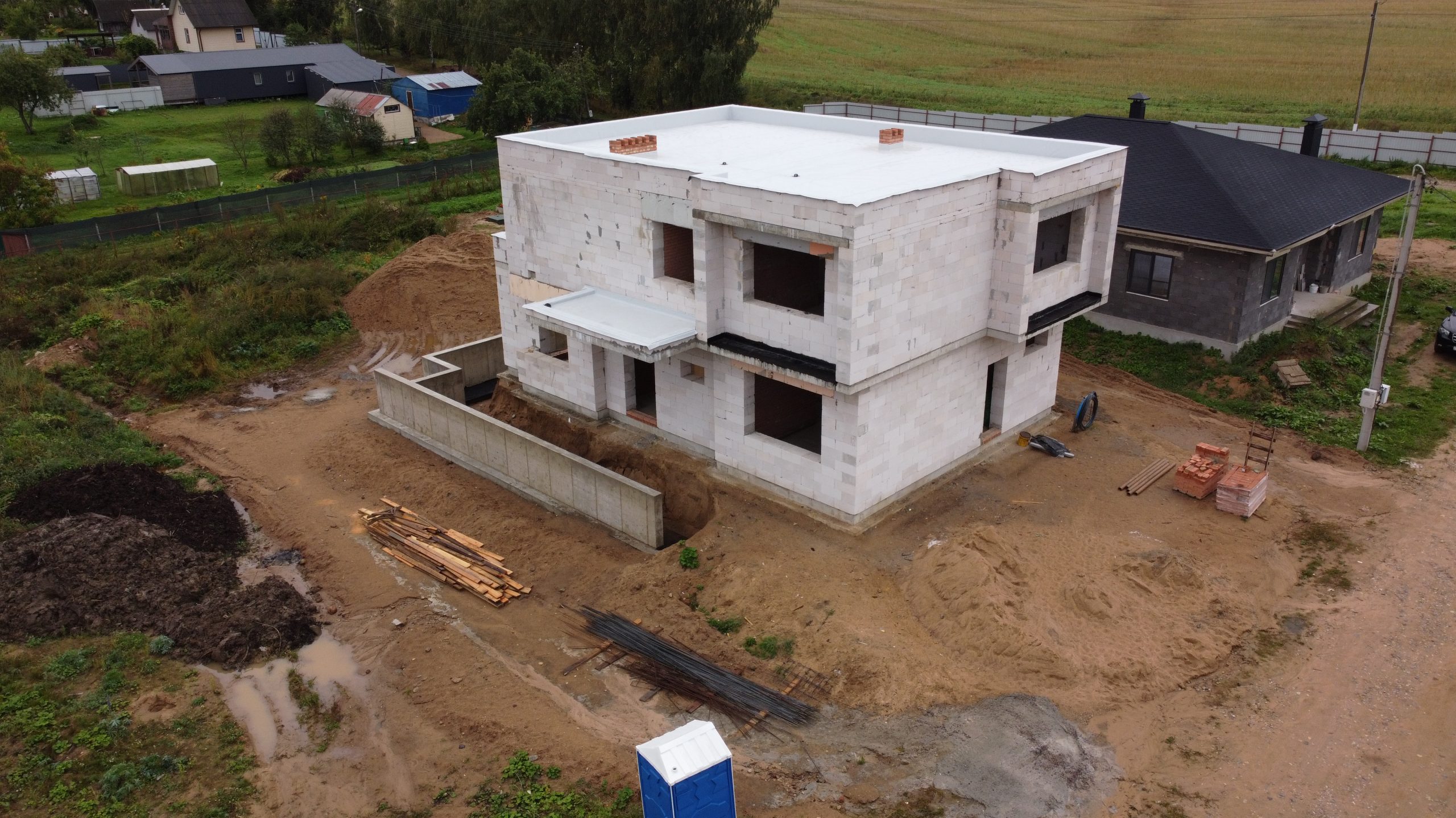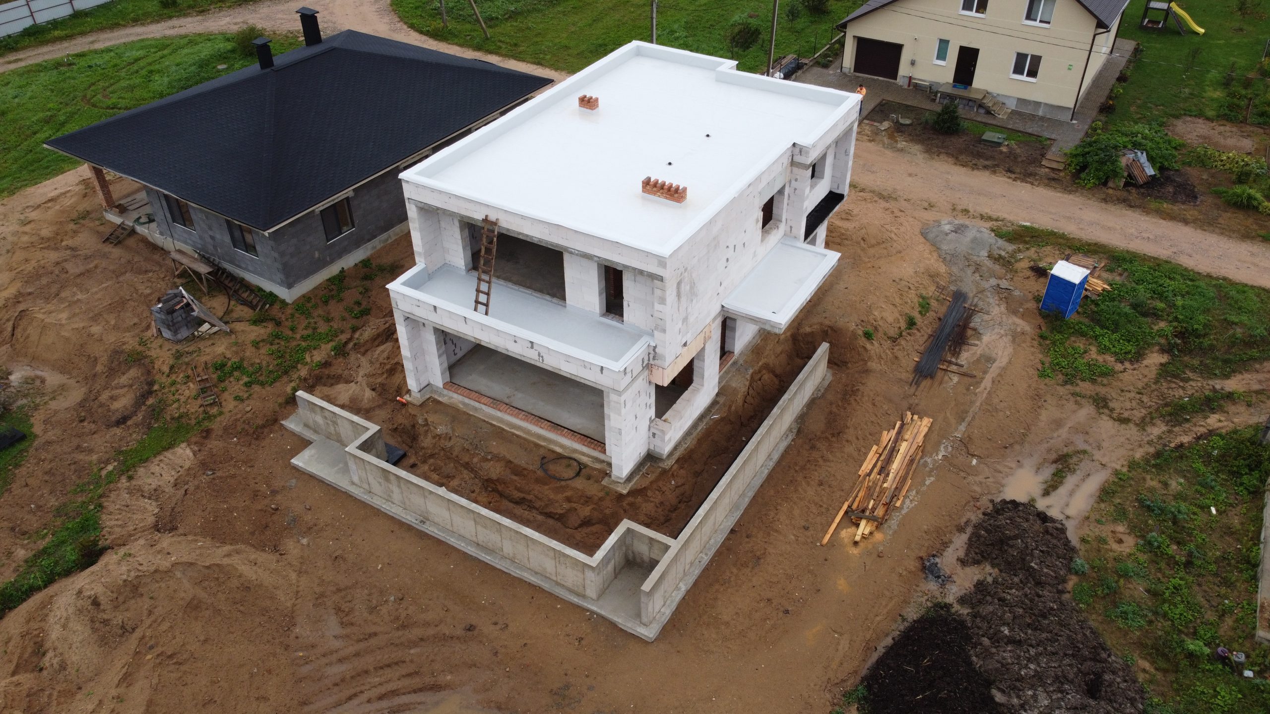 По проекту в данном жилом доме предусмотрена плоская кровля. Было принято решение выполнить ее из ПВХ мембраны. Первым этапом сделали обмазочную и оклеечную пароизоляцию.