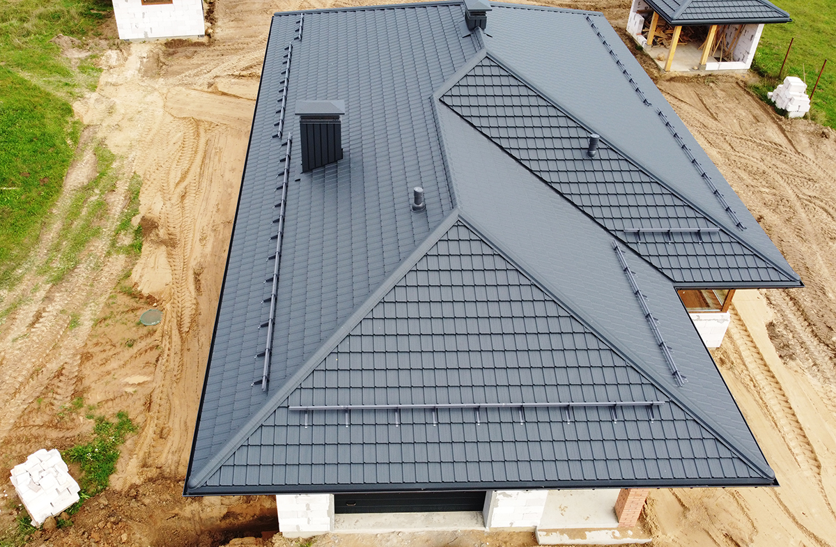 Когда обрешетка была готова - приступили к монтажу кровельного покрытия. Заказчик хотел современный внешний вид кровли, поэтому выбор пал на кровельные модули Budmat Murano D-matt RAL 7016 пр-ва Польша. Сразу были смонтированы все необходимые элементы кровли: штучные вентвыходы для вентиляции помещений, трубчатые снегозадержатели, а также ПВХ водосточная система Budmat ProAqua в цвет кровли.