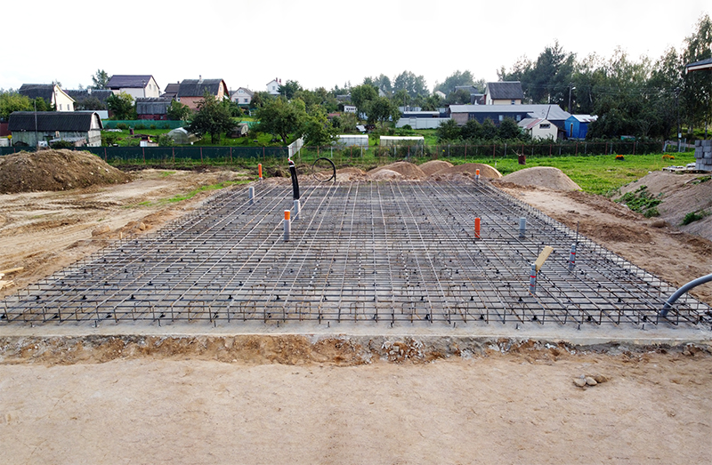 Совместно с проектировщиками было принято решение выполнить фундамент в виде плиты. В уплотненном грунте выполнили разводку всех коммуникаций, залили черновую подготовку из тощего бетона, после чего начали вязать арматуру пространственного арматурного каркаса плиты и устанавливать опалубку.