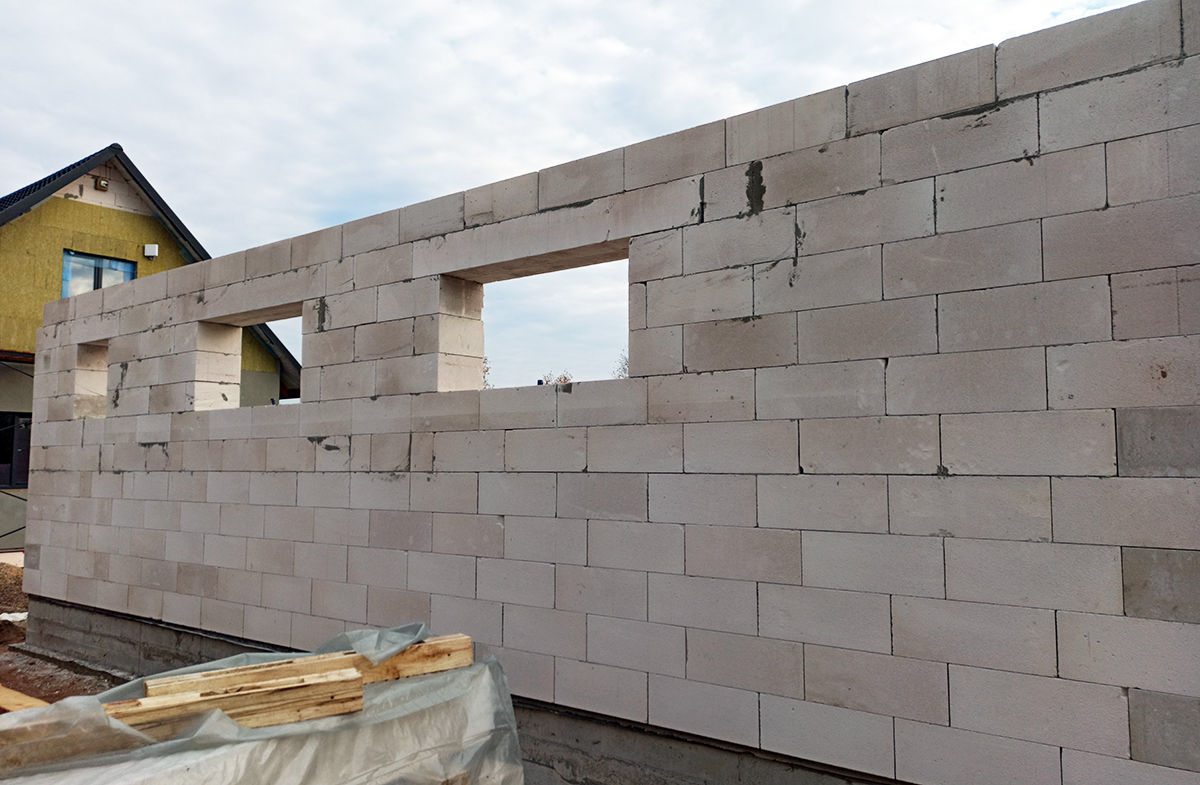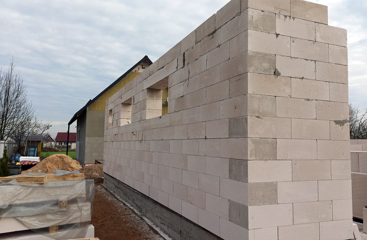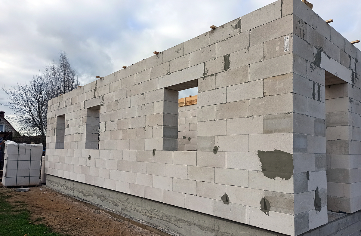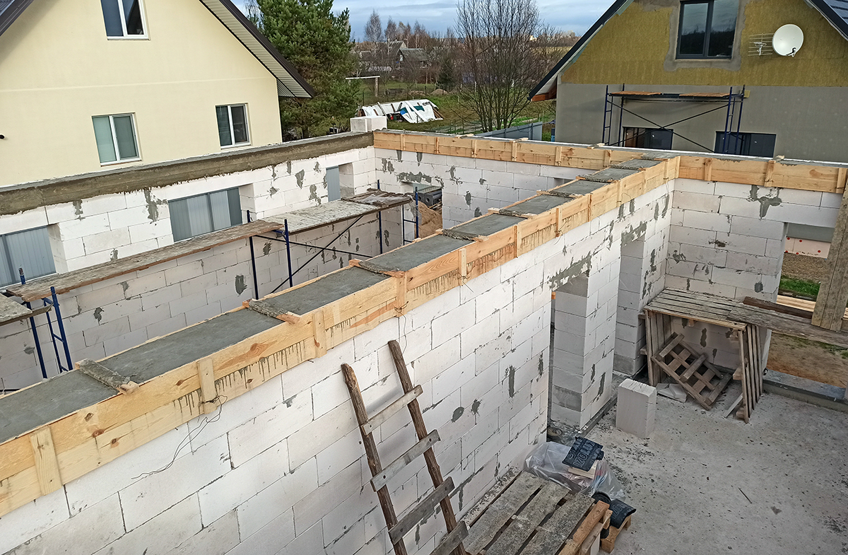 возведение стен из газосиликатных блоков, заливка монолитного пояса, монтаж крыши.