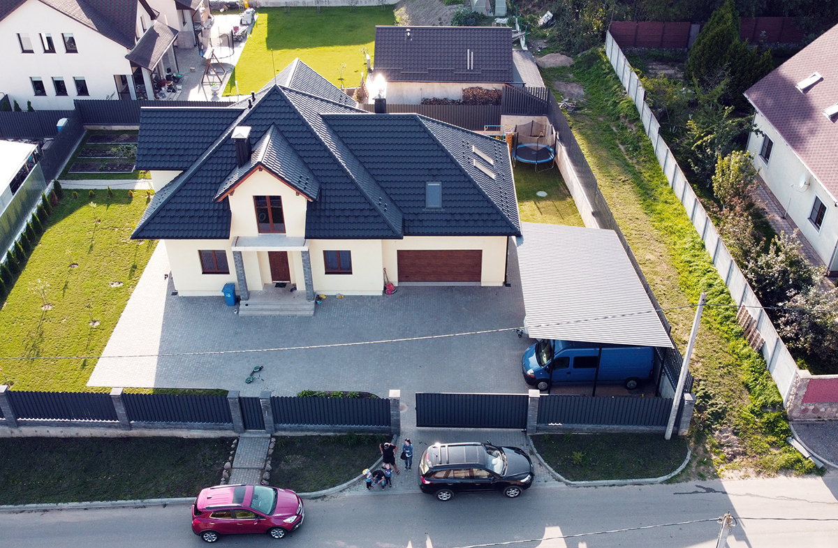 В данном населенном пункте много участков со специфическим рельефом – перепады по высоте до 4м. Поэтому было принято решение разделить участок на две части по высоте: одна часть под жилой дом, вторая для хозпостройки, а от хозпроезда отделиться подпорной стенкой. После геодезической разметки мы смонтировали фундамент, выполнили гидроизоляцию и начали кладку коробки.